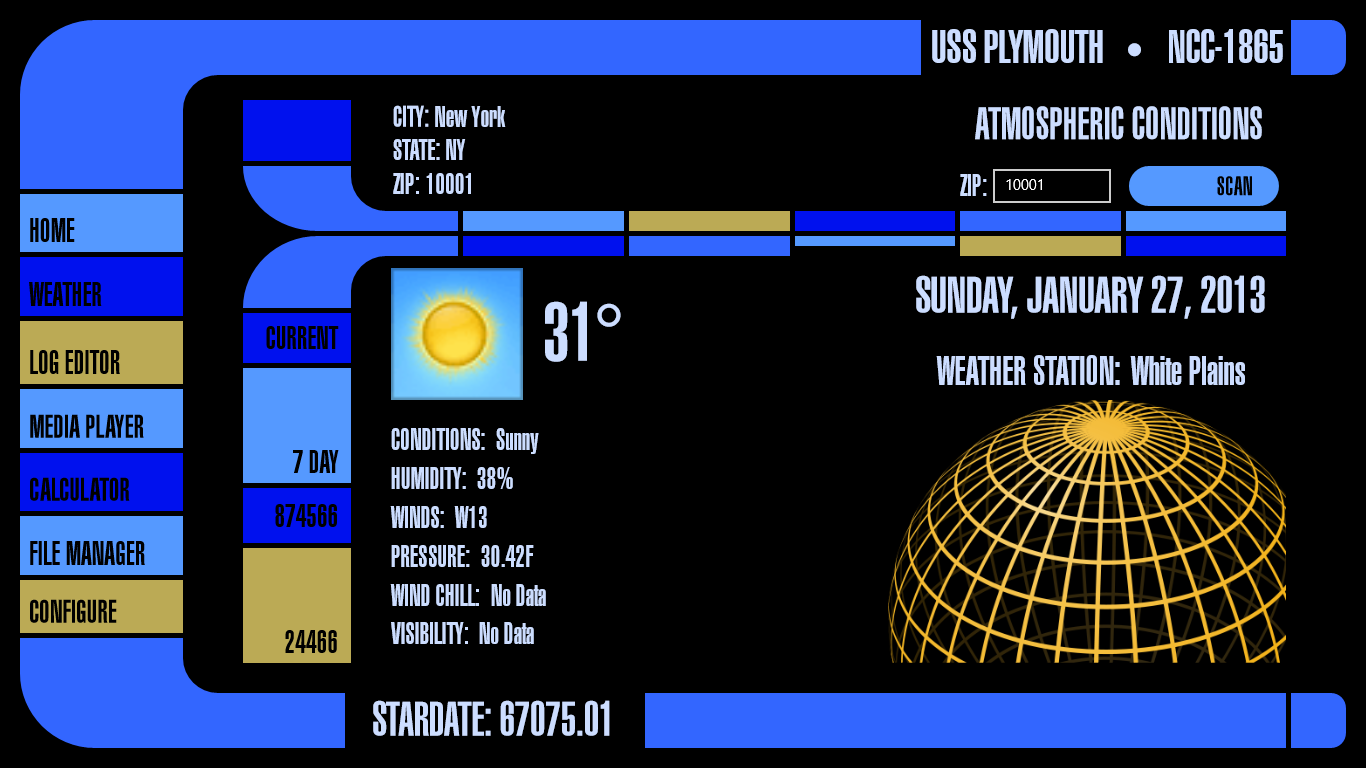 I have several things on my list to add, but I can only get to so many of them at a time. In the pipeline are weather information, and some enhancements to the media player that will give you more information on what's being played for both music and videos, as well as the controls on the full screen mode getting added to. I have thoughts of a web browser as well if I can work out the screen real estate details. Having this should help those using Windows 8 tablets to remain in the LCARS Interface longer since I think web browsing is one of the biggest things tablets are used for. Not that desktop users won't like it also :)
